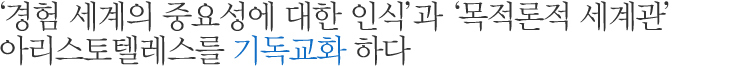 아퀴나스가 아리스토텔레스로부터 물려받은 가장 중요한 유산은 경험세계의 중요성에 대한 인식과 목적론적 세계관이다. 경험적이고 현실적인 것에 주목한 아리스토텔레스로부터 아퀴나스는 진리에 도달하기 위해서 구체적이고 현실적인 것에서 출발해야 함을 배웠다. 플라톤의 영향을 받은 아우구스티누스는 인간의 참된 지식은 신이 인간에게 빛을 비추어서 알게 된다고 주장한다. (이를 “신의 조명설”이라고 한다.) 그러나 아퀴나스는 신의 직접적인 개입 없이 인간의 이성을 통해서 진리에 도달할 수 있다고 믿었다. 이는 현실세계에 존재하는 감각적 대상으로서의 자연물도 실재로 간주하고, 경험과 인간 이성을 통해서 그러한 실재에 대한 지식을 탐구하려는 아리스토텔레스의 영향 때문이라고 할 수 있다. 또한 이러한 경험을 중요시한 점은 아퀴나스의 신의 존재 증명에서도 분명하게 나타난다. 아퀴나스 이전의 철학자들은 신은 인간의 정신에 자명하게 드러난다는 이른바 선험적인 증명을 시도했지만, 아퀴나스는 신의 존재가 인간의 감각적 경험을 토대로 한 증명을 통해서 우리에게 인식된다고 설명함으로써, 경험적 신 존재 증명을 제시한다. |
