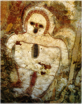한편 위 그림은 오스트레일리아의 킴벌리에서 발견된 것으로 약 5천년 전의 것이다. 역시 양식의 차이는 있지만 머리에 헤드 기어를 착용하고 이 부분이 빛나고 있는 듯한 묘사는 위와 동일하다. 특히 이 그림의 경우 맨 위 그림과 같이 몸 전체를 둘러싸는 수트를 입고 있는 모습이 상당히 구체적으로 그려져 있다. 물론 그 시절에 이런 복장은 제작 기술은 물론 개념 자체가 존재하지 않았다고 봐야 할 것이다. 몸의 중앙에 있는 정체불명의 검은 장치나, 인물의 우측이나 등뒤로 연결된 호스와 유사한 물체는 역시 현대 우주비행사의 모습과 무척 유사하다.