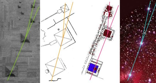왼쪽 끝부터 중국 장안, 이집트 기자, 멕시코의 마야, 그리고 오리온.