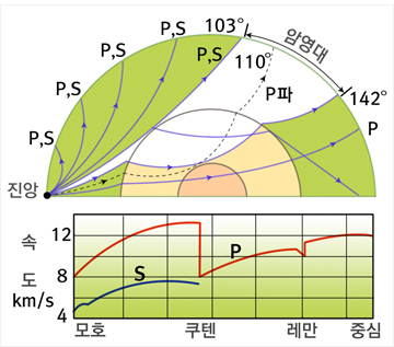 지진을 일으키며 에너지가 처음 방출된 곳을 진원이라 하며, 진원에서 연직으로 지표면과 만나는 점을 진앙이라 한다. 진원지에서 지진이 발생하면 그 점을 중심으로 암석 내에 저장되어 있던 탄성에너지의 일부가 탄성파로 모든 방향으로 전달되어 가는데, 이것이 지진파이다. 지진파의 종류에는 지구 내부를 깊숙이 통과해가는 실체파인 P파와 S파가 있으며, 지구표면 가까이의 바깥층을 따라 전파해가는 표면파로 러브파(L파)와 레일리파(R파)가 있다. 또 큰 규모의 지진이 발생한 후에는 마치 종이 울리고 난 후처럼 수일 내지는 수 주일에 걸쳐 지구 전체가 진동하는, 지구의 자유진동(自由振動)이 관측된다. P파는 음파처럼 어떤 매질을 통과할 때 파의 진행방향과 진동방향이 같은 종파이며 가장 먼저 도착하므로 Primary wave(P파)라 하며 압축과 팽창을 거듭해서 부피변화를 일으킨다. 종파는 고체, 액체, 기체의 모든 매질을 통과한다. S파는 파의 진행방향에 수직 방향으로 진동하는 횡파로 두 번째로 도착하므로 Secondary wave(S파)라 하며 매질의 모양변화를 가져온다. S파는 고체만 통과할 수 있다. 표면파는 지표면의 움직임을 가져온다. 레일리파는 해양의 너울처럼 땅을 출렁거리게 하며 러브파는 파의 진행방향에 대하여 지표면의 입자들이 수직으로 좌우 진동을 하게 하여 건물에 막대한 구조적 변화를 줘서 가장 많은 지진피해를 끼친다.