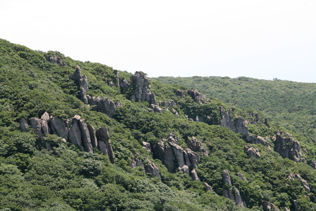 겨우 겨우 달래어 간신히 경사 길을 얼마간 오르니 오백나한이라도 하고 병풍바위라고 하는 거대한 바위가 보였다.