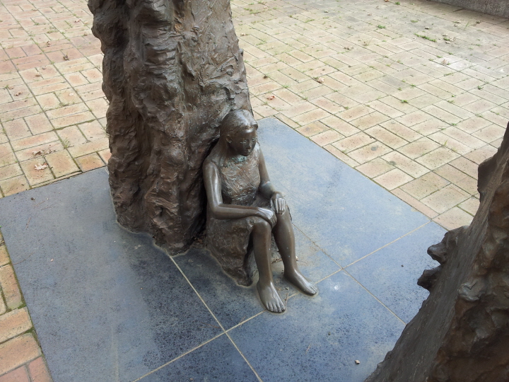 메마른 땅에 웅크린 우울한 소녀 앞에서