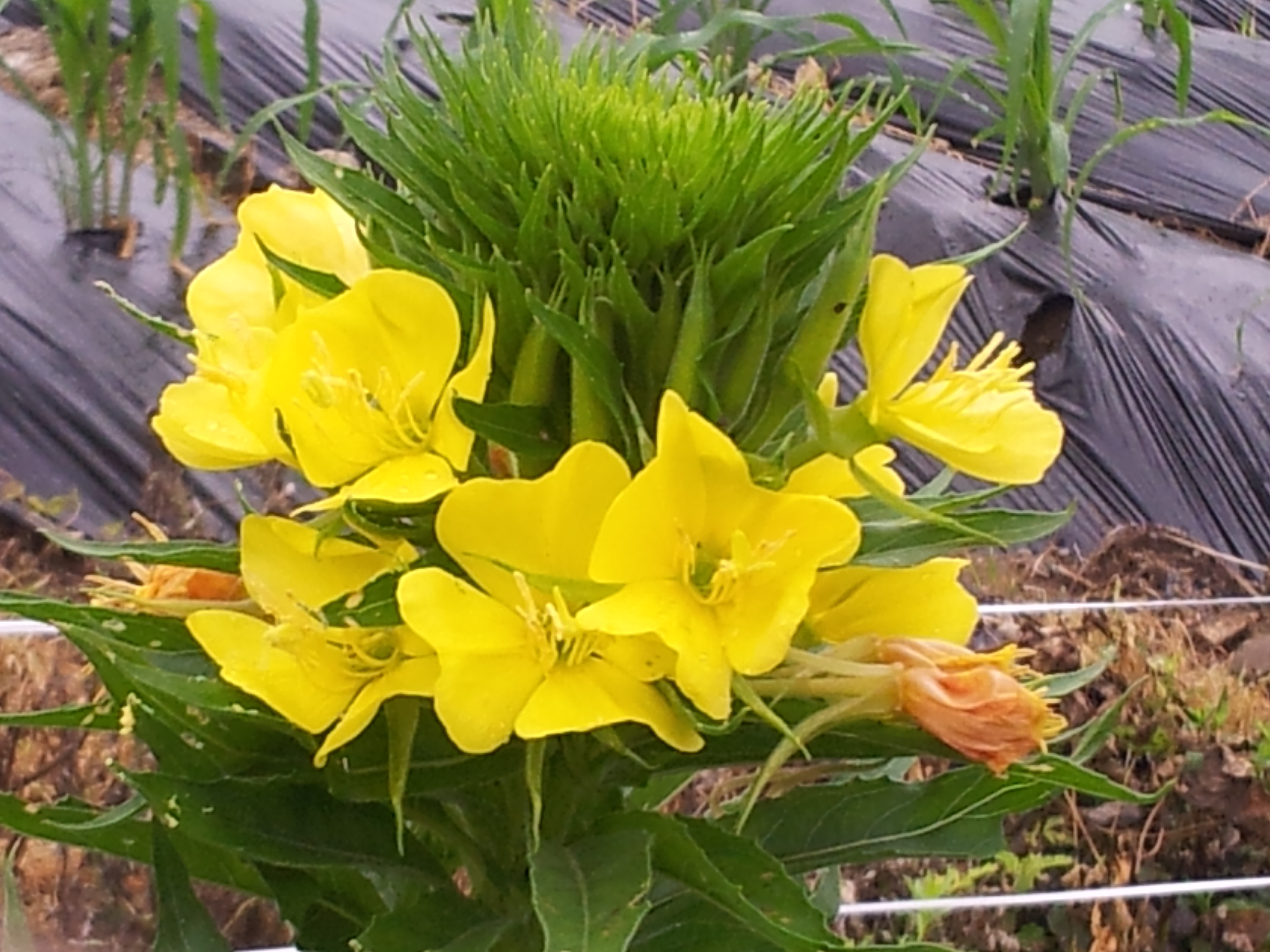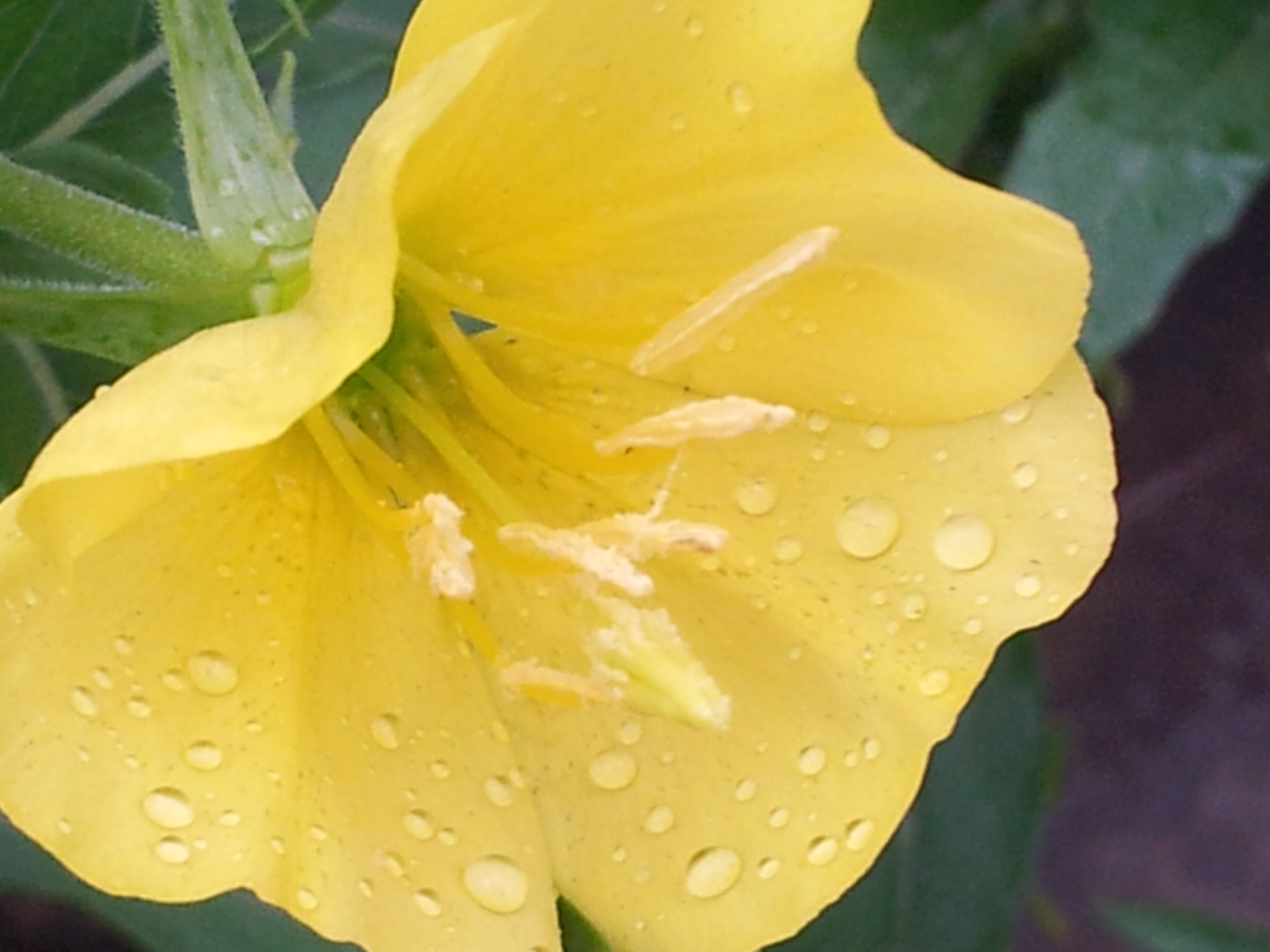 하늘 빛 이슬 맺힌 노란 꽃송이가