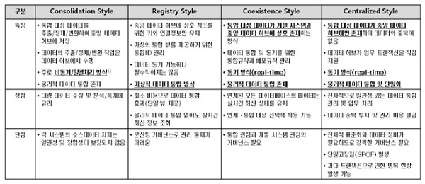 물리적인 데이터의 위치와 데이터 통합 및 연계 기술을 결정하는 데이터 통합 유형은 Centralized Style, Coexistence Style, Registry Style, Consolidation Style로 분류된다. 이러한 통합 유형은 Reconciliation(=Coexistence) Style, Transaction Hub(=Centralized) Style 등 여러 기관이나 단체에서 다소 다른 명칭을 사용기도 하지만 설계 방식은 매우 유사하며 점차 가트너에서 분류한 4가지 기본 유형이 일반화되고 있다