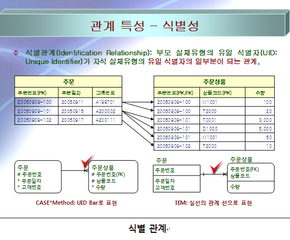 그림 식별관계에서 실체유형 “주문상품”의 “상품코드”가 ‘M1001’인 건을 인식한다는 것은 업무적으로 의미가 없고, 반드시 “주문번호” + “상품코드”(‘20050909‘ + ‘M1001’)로 인식해야만 실체유형 “주문상품”의 실체를 정확히 인식할 수 있는 것이다. 이렇게 업무적인 관점에서 어느 실체유형의 실체(멤버)를 식별할 때, 반드시 관계가 있는 실체유형의 실체(멤버)를 먼저 식별할 필요가 있는 업무의 관계를 표현할 때 식별관계로 표현한다.