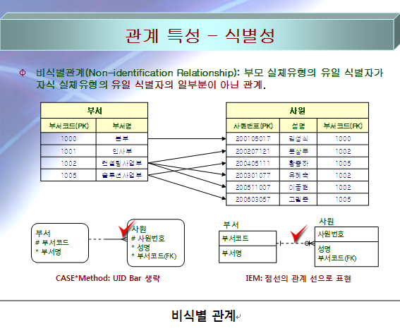 그림 비식별관계에서 실체유형 “사원”의 “사원번호”가 ‘200105017’인 ‘김성식’을 식별하는데 있어서, 반드시 실체유형 “부서”의 “부서코드”가 ‘1000’인 ‘본부’라는 것을 인식할 필요는 없다.이렇게 업무적인 관점에서 어느 실체유형의 실체(멤버)를 식별할 때, 관계가 있는 실체유형의 실체(멤버)를 먼저 식별할 필요가 없는 업무의 관계를 표현할 때 비식별 관계로 표현한다.