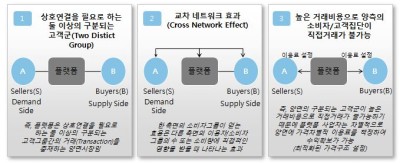 3. 높은 거래비용으로 양측의 소비자/고객집단 간의 직접거래가 불가능하기 때문에 플랫폼 사업자는 차별적으로 양면에 가격차별적 이용료를 책정하여 수익확보가 가능함