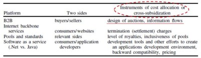 이 논문에서는 서로 다른 두 성질의 이용자 그룹 간에 발생하는 교차 보조의 확대는 플랫폼 사업자가 정하는 가격 수준/가격구조와 관련성이 높다고 강조하고 있는 점이 특징이다. Rochet & Tirole는 플랫폼 사업자가 Subsidized Segment(보조의 객체, 보조금을 지급받는 이용자)와 Subsidizing Segment(보조의 주체, 보조금을 지급하는 이용자)간의 효율적 교차 보조를 지원할 때 교차 네트워크 효과가 발생하는 것으로 접근하고 있다. 즉, 플랫폼 사업자가 제대로 된 ‘교차 보조’ 전략을 구사하지 않으면 ‘교차 네트워크 효과’는 자발적으로 발생하지 않는다는 것이다. 따라서 플랫폼 사업자가 양면의 이용자 그룹에 부과하는 가격할당(Price Allocation), 그리고 이에 영향을 주는 요인(Instruments)을 잘 구성하는 것이 매우 중요하다고 강조한다(*가격할당은 플랫폼 사업자가 양면의 이용자 그룹에 부과하는 이용료의 수준과 구조를 의미함).