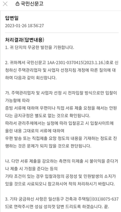 국토부는 이에 “민원 처리에 관한 법률 및 공동주택관리법 93조에 따라 공동주택관리 감독 권한은 지자체 소관이므로 해당 지자체(고양시)에 이송한다”며 “다만 입찰자가 등록한 서류와 별도 인쇄본의 진위 여부에 대한 책임 소재를 감안할 것”을 내용으로 회신한 바 있다.